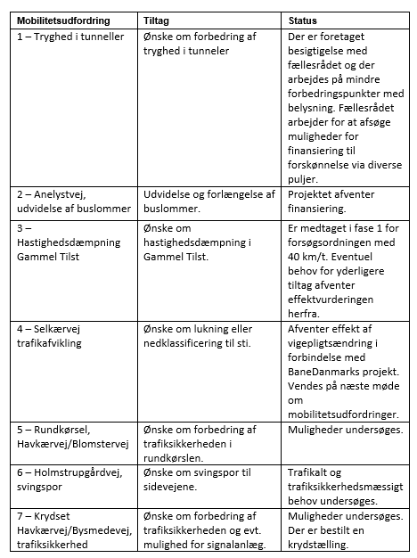 Vi har op til sommerferien fået en oversigt over de mobilitetsudfordringer vi har haft vendt med kommunen over det seneste par år. Der er desværre ikke så meget udvikling på de forskellige udfordringer som vi har ønsket. Vi har valgt et par af dem ud, som vi vil prøve at se om vi kan få en nærmere opdatering på.